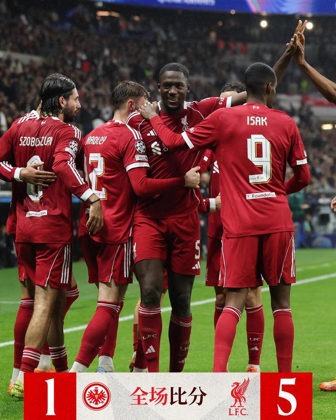 北京时间10月23日凌晨,欧冠联赛阶段第3轮一场焦点战,由法兰克福主场迎战利物浦。最终,利物浦依靠埃基蒂克、范戴克、科纳特、加克波、索博斯洛伊的联袂破门,以5-1客场逆转法兰克福,终结各项赛事4连败战绩。